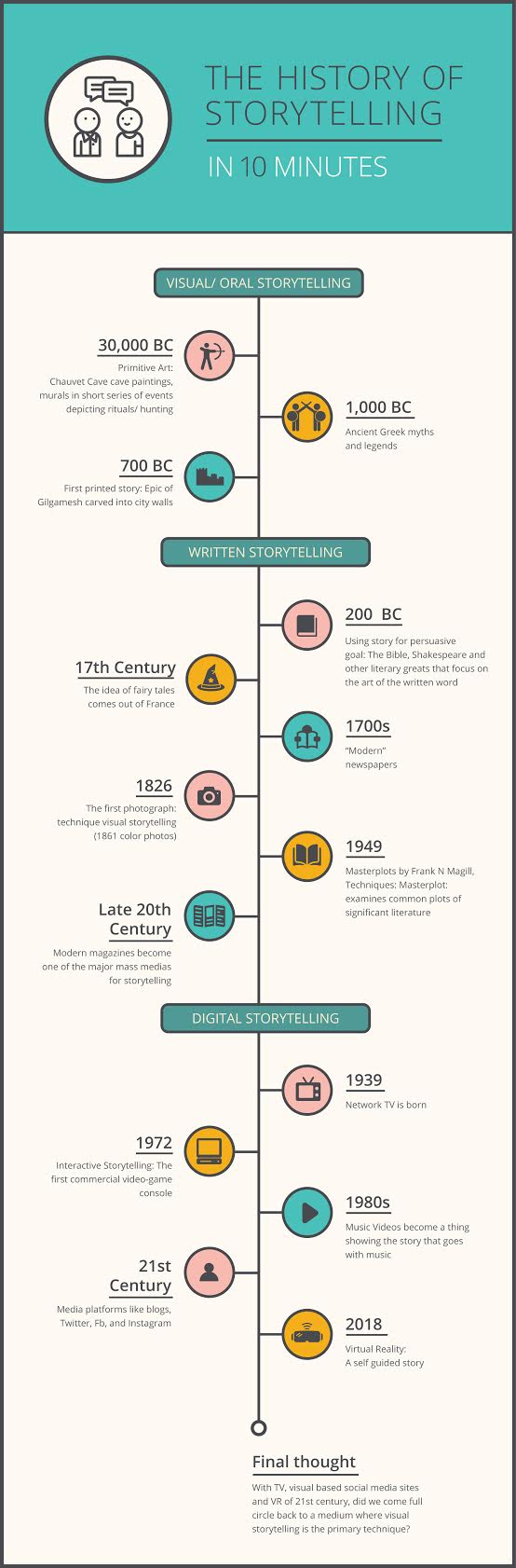 Jumping forward to today, we can look back and see how storytelling has evolved to include new mediums that help us reach a bigger audience for our stories. Storytelling has never been easier than today. We have evolved from chipping rock that communicated trouble ahead for a few "readers" to tweeting 128 characters in a blink of an eye that can reach millions of people.